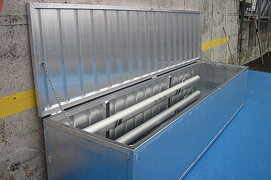 Die abschliessbaren Gerätebehälter aus Aluminium-Hohlprofilen sind sehr robust und wetterfest.