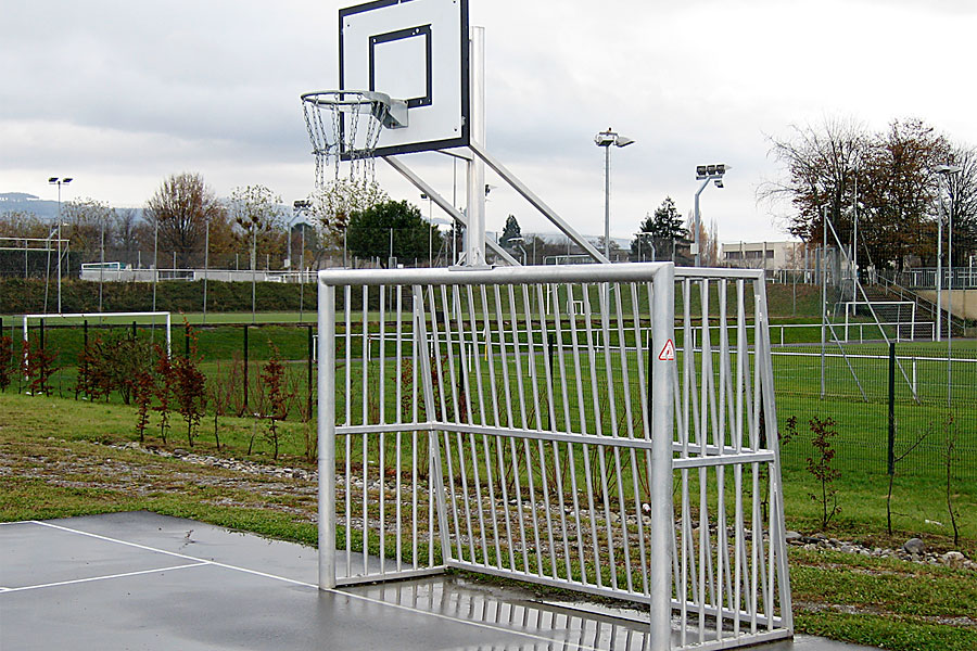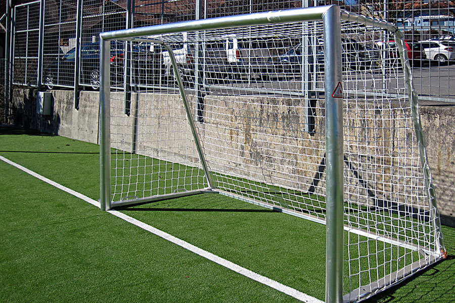 Spielplatztor Alu vollverschweisst, mit Polypropylen-Netz, anti-vandalismus Netz oder als Rohrgitterkonstruktion. Auch als Kombi-Tor mit Streetball-Aufsatz.