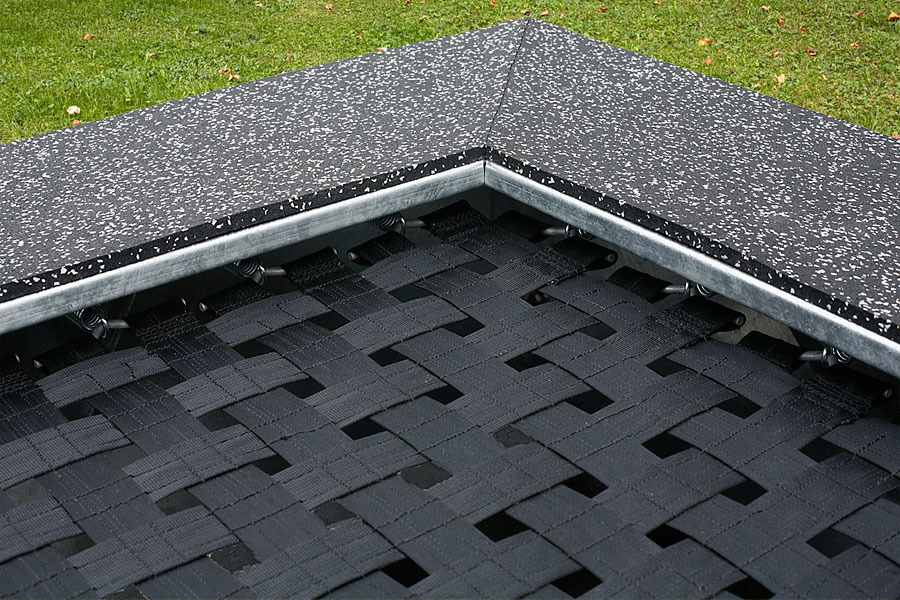 - Sprungfläche aus sehr robust, geriffelten Kunststofflamellen, Farbe schwarz, andere Farben auf Anfrage (UV- und witterungsbeständig, mit Messer nicht zerschneidbar). Die Sprungfläche kann für Wartungsarbeiten demontiert werden.