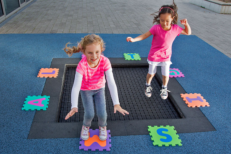 Die quadratischen Spielplatz-Trampoline werden vorzugsweise in Gruppen angeordnet von zwei bis drei in einer Reihe oder vier im Quadrat. So können die Trampolinspringer von einem auf das andere Trampolin springen.