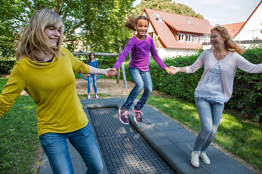 Das Spielplatz-Trampolin «Kids Tramp» eignet sich für eine Gruppenanordnung von zwei bis drei in einer Reihe oder vier im Quadrat. So können die Trampolinspringer von einem auf das andere Trampolin springen.