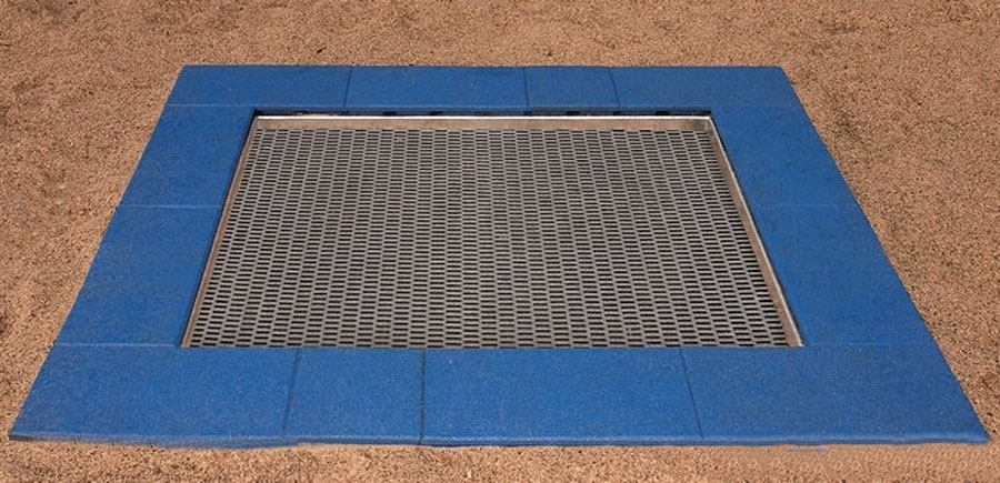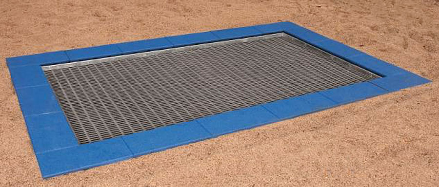 - Sprungfläche aus sehr robust, geriffelten Kunststofflamellen, Farbe schwarz, andere Farben auf Anfrage (UV- und witterungsbeständig, mit Messer nicht zerschneidbar). Die Sprungfläche kann für Wartungsarbeiten demontiert werden.