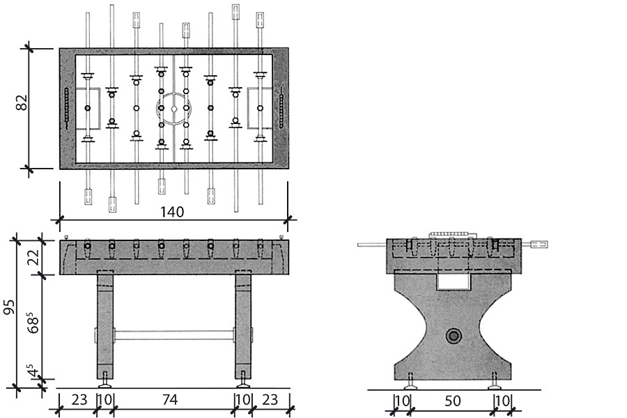 Sockel und Spielteil aus armiertem Beton, mit längsseitigem Kantenschutzprofil aus rostfreiem Stahl. Spielfläche mit Acrylharzanstrich und weisser Linienmarkierung. Sockel mit vier Stellschrauben. Spielstangen aus Chromstahl, Spielfiguren aus Kunststoff (fertig montiert). Inkl. Abdeckplane.