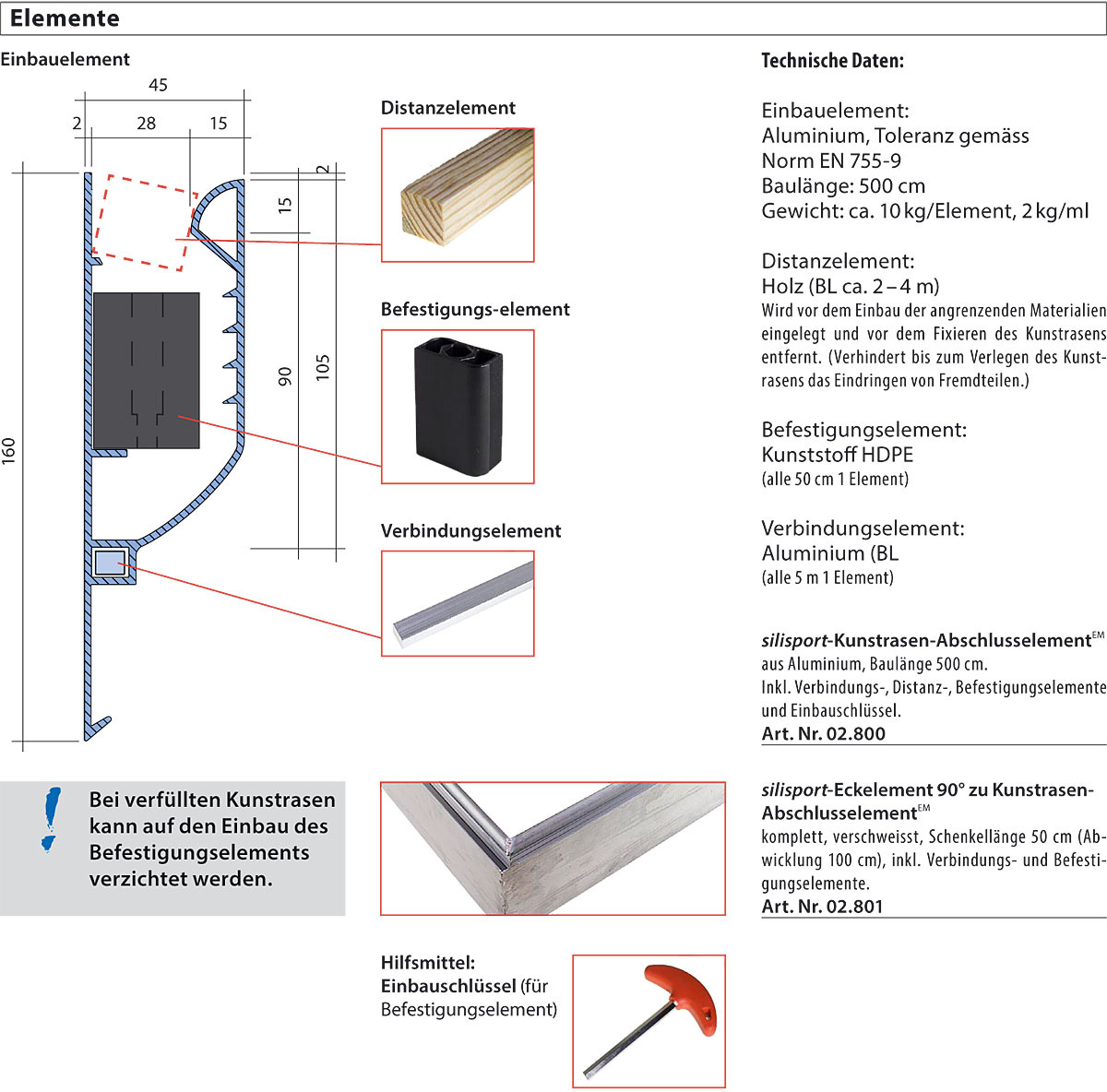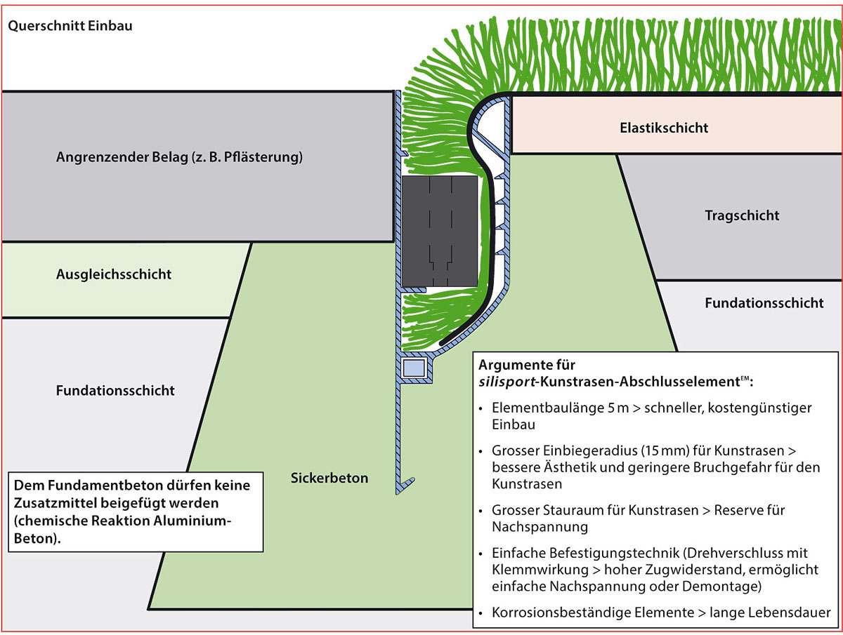 - Nach dem Ablängen und/oder Nachspannen des Kunstrasens, Einbau gemäss obigem Beschrieb und Bilder.